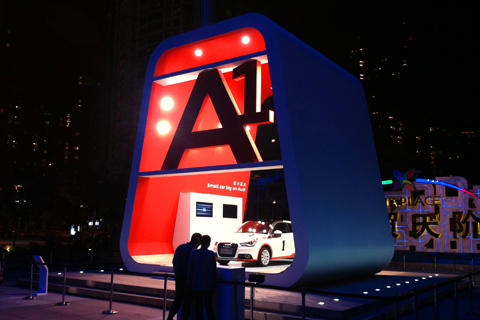 Car insurance provider Sheila’s Wheels is renowned for its clear and consistent corporate branding. The car, the dresses, and the pink are all associated with the company, so they’re an important part of the stand. This is great in its design because it is simple, instantly recognisable, and effective. - Audi