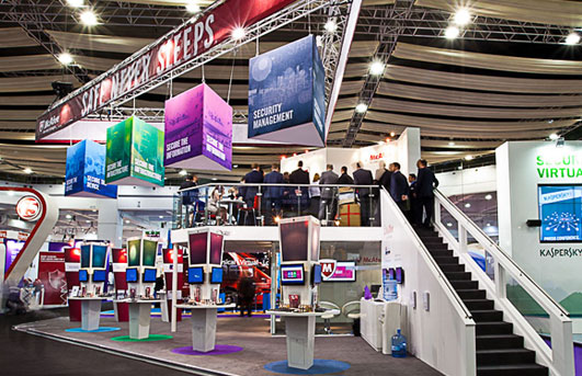Online security specialists McAfee really stand out from the crowd with their weird but very wonderful 2-storey exhibition stand. With handing signage in vibrant colours, a striking carpet, and private seating areas; this stand is somewhere you want to be.