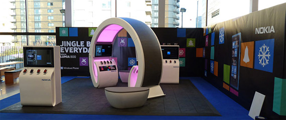 Confectionary giant Cadbury are famed for their purple branding and quirky designs. This eye-catching custom stand looks good enough to eat! Complete with chocolate splodges and spoon, this stand looks just like the company’s range of desserts. The unique stand matches Cadburys’ brand identity, and is sure to be a main attraction at any exhibition. - Nokia