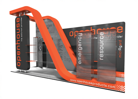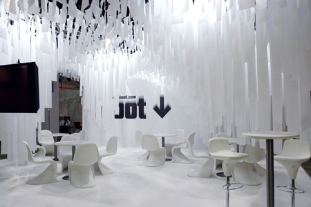 Created from suspended ribbons, it would be impossible to ignore the stand for this social networking site. With a crisp colour scheme, seating area, and undoubtedly interesting tale behind the designs; this stand is one of a kind. - Open House