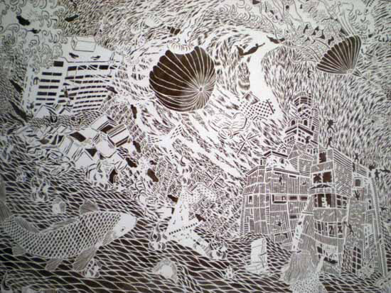 Bovey Lee was born in Hong Kong, completing her BA degree in 1991. After moving to the USA in 1993, she began to get noticed for her terrific paper cutouts. The piece above is entitled: ‘Tsunami’.