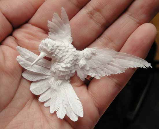 Incredibly beautiful, this tiny, lifelike hummingbird is expertly crafted with individual feathers cut from paper. The patience (not to mention steady hand) needed to produce something of this quality is really mind-boggling.