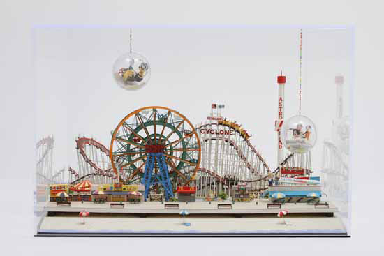 From a distance, you can see Yumiko Matsui’s miniature, paper recreation of New York’s famous Coney Island in its entirety. It’s very impressive. When you get closer, however, it becomes even more awe-inspiring, as individual human characters on the rides come into view.