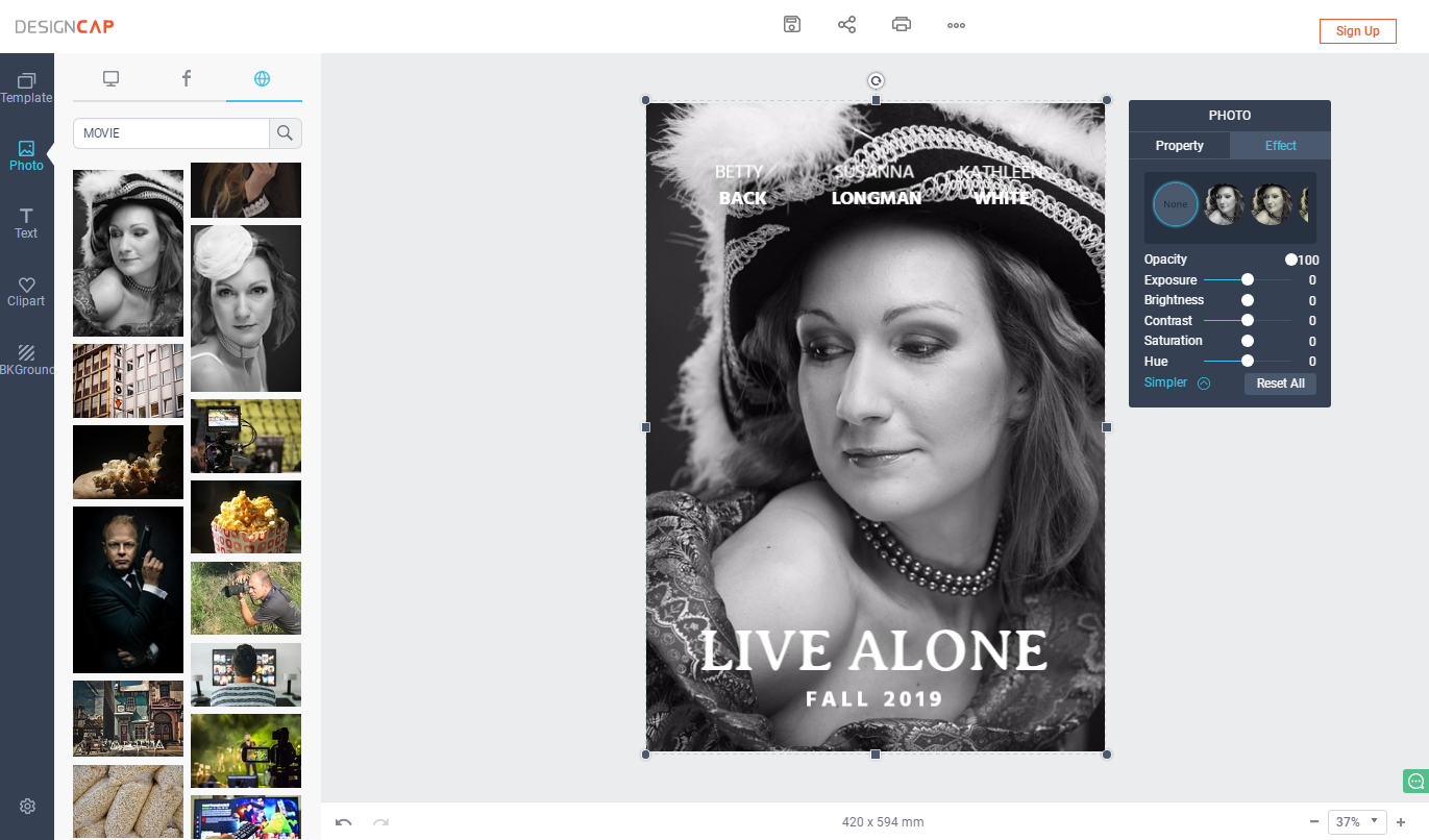 If you already have a specific idea in mind, you can start the poster with a blank template. I just choose one I like. Every template can be customized freely. Let’s start to personalize it with adding a photo. DesignCap allows users to add photos from local computer, Facebook album, and search photos online for free. I’ve search from Pixabay data base.