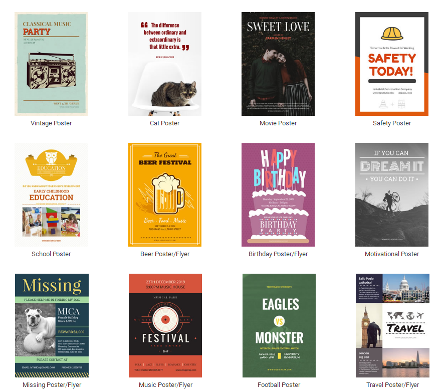You can easily make your own posters online with DesignCap, a free web-based poster making tool. It offers many poster templates that you can customize to your needs, so that you can design straight in your browser. Here let’s go with it.
