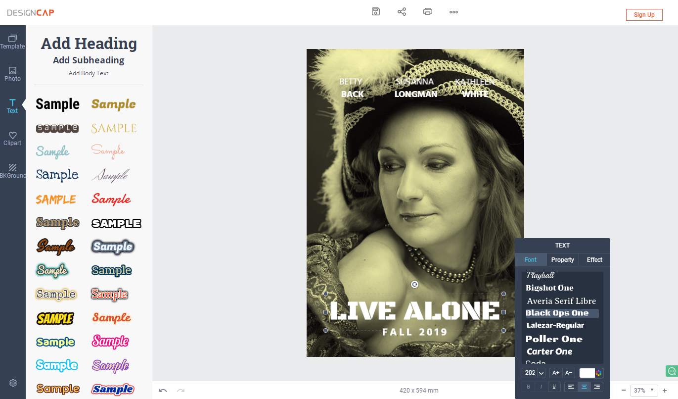 The overall design looks good, so now it’s time to add some information. You can fine many preset text styles at the left list. You can just use the preset styles or manually change the text and adjust its font and color freely with the easy to use text editing tools.