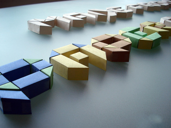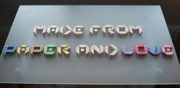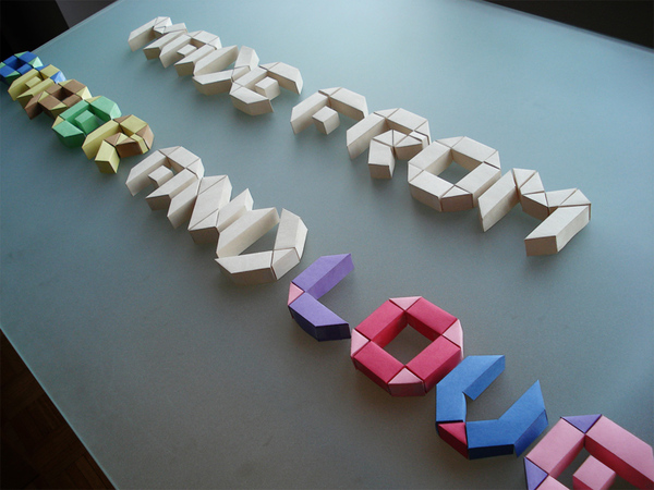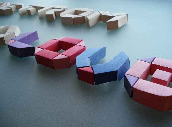 Originally created with a flat typeface in mind, paper & love is based on an octagonal grid and origami folds. The digital version represents this concept of origami by emphasizing transparency and by focusing on the shapes of the letter. The majority of the two-dimensional letters can be obtained by simply folding thin strips of paper and by following the octagonal grid. By taking what I had initially envisioned for the digital version, I created a new set of letters in 3D using paper, an x-acto knife and, of course, love (corny but true) !