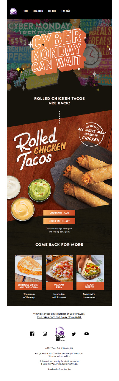 TacoBell promotions for Cyber Monday are different than the usual deals, discounts, and offer emails. Unique things we liked about this email are: