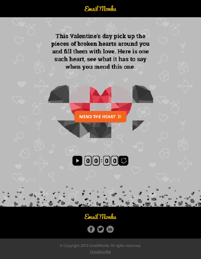 Here is yet another stunner by Email Uplers (erstwhile Email Monks). The Valentine’s day email template by them is charming, interactive, and creative. Elements you can get inspired by are: