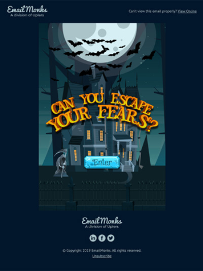 This stellar email template by Email Uplers (erstwhile EmailMonks) is a great example and even greater inspiration for how you should design your winter newsletter around Halloween. The elements you should look for are:
