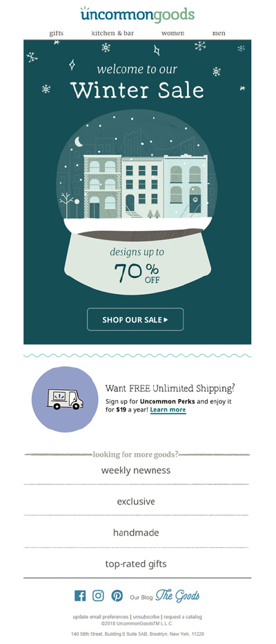 This email by UncommonGoods portrays the winter vibes in full swing. What we liked about the email is: