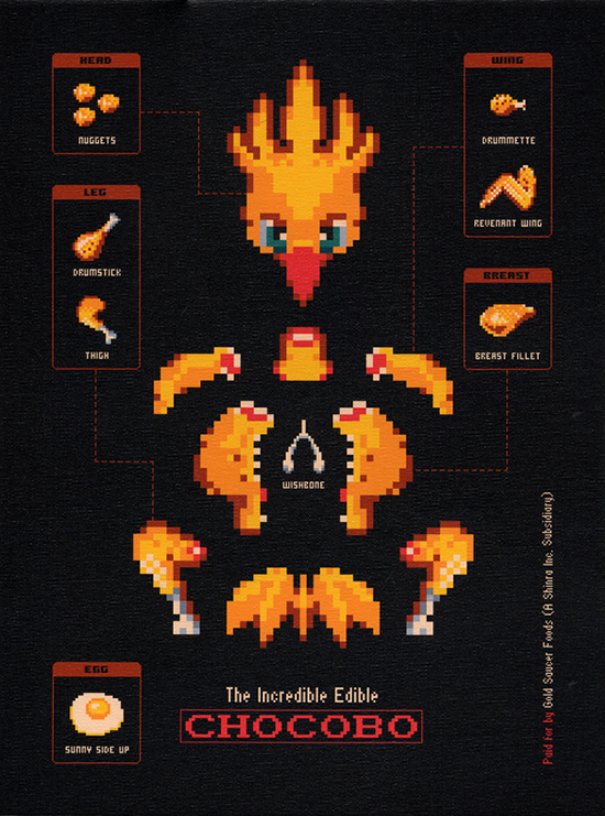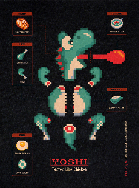 One of his most intriguing projects that play up the real/fantasy conflict is the “8-Bit Butcher Diagrams”. He literally dissects his memories of some of the most popular videogame animals and monsters. This was a result of his morbid fascination with butcher diagrams depicting cut-up cows, pigs, and chickens in all of their grotesquely delicious glory.